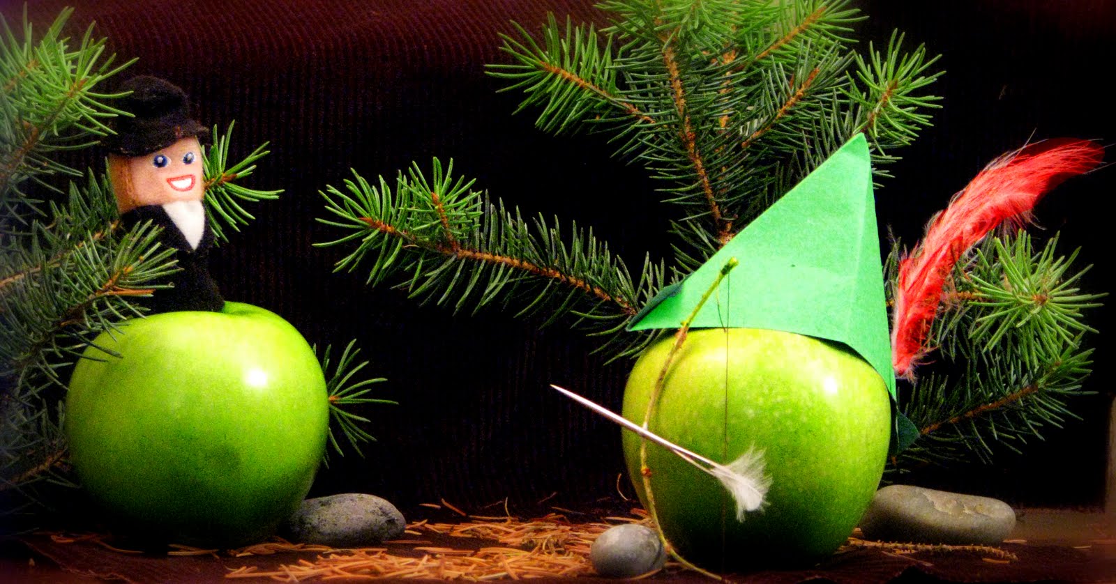 Sharon and Trevor helped me with my apple pictures. The class grades these, the top 10 get As, the next 10 get Bs..so on. So they reallly have to catch the classes eye so they will vote on them. This one is like the tables have turned, instead of robin hood shooting apples off little john's head, the apple is shooting the human :)